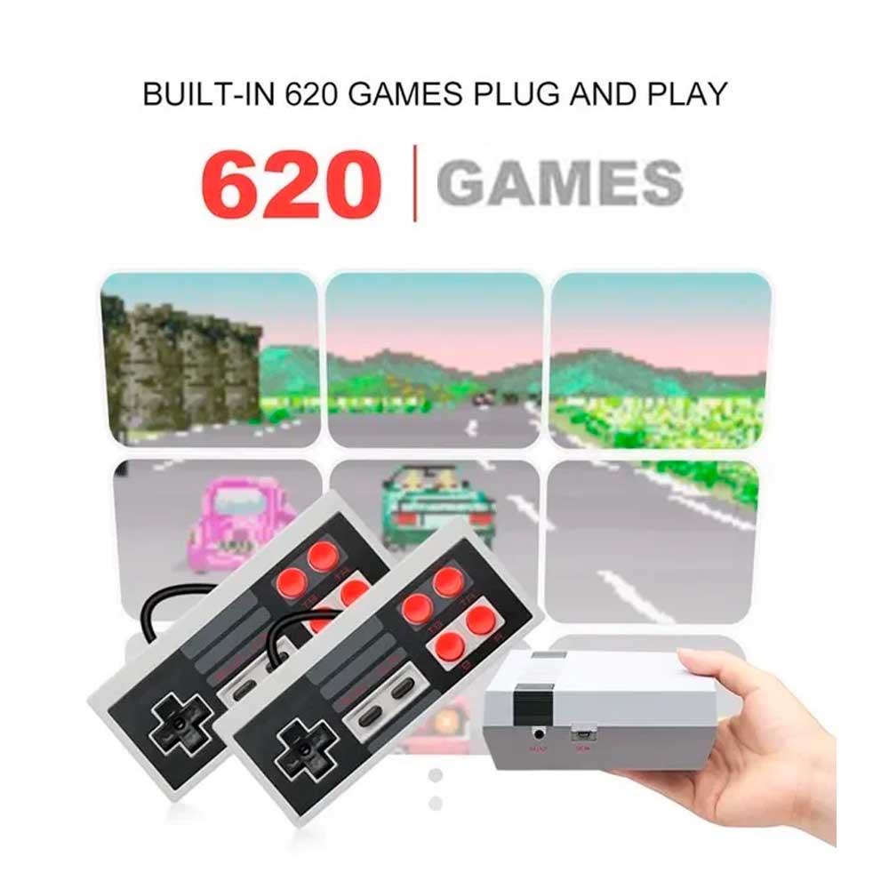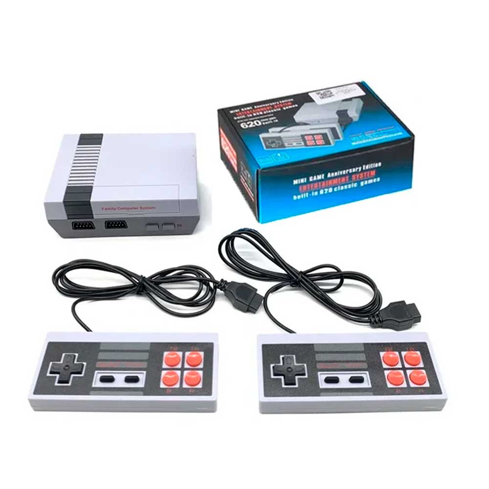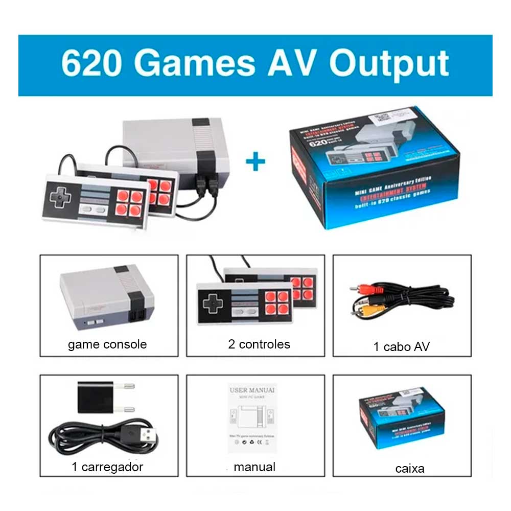 Divirta-se com o Console Mini Game Anniversary Edition, que apresenta 620 jogos clássicos já pré-instalados e com 2 controles com visual nostálgico para que você possa jogar sozinho ou com um amigo, conexão com porta AV para o seu televisor com conexão NTSC e PAL.